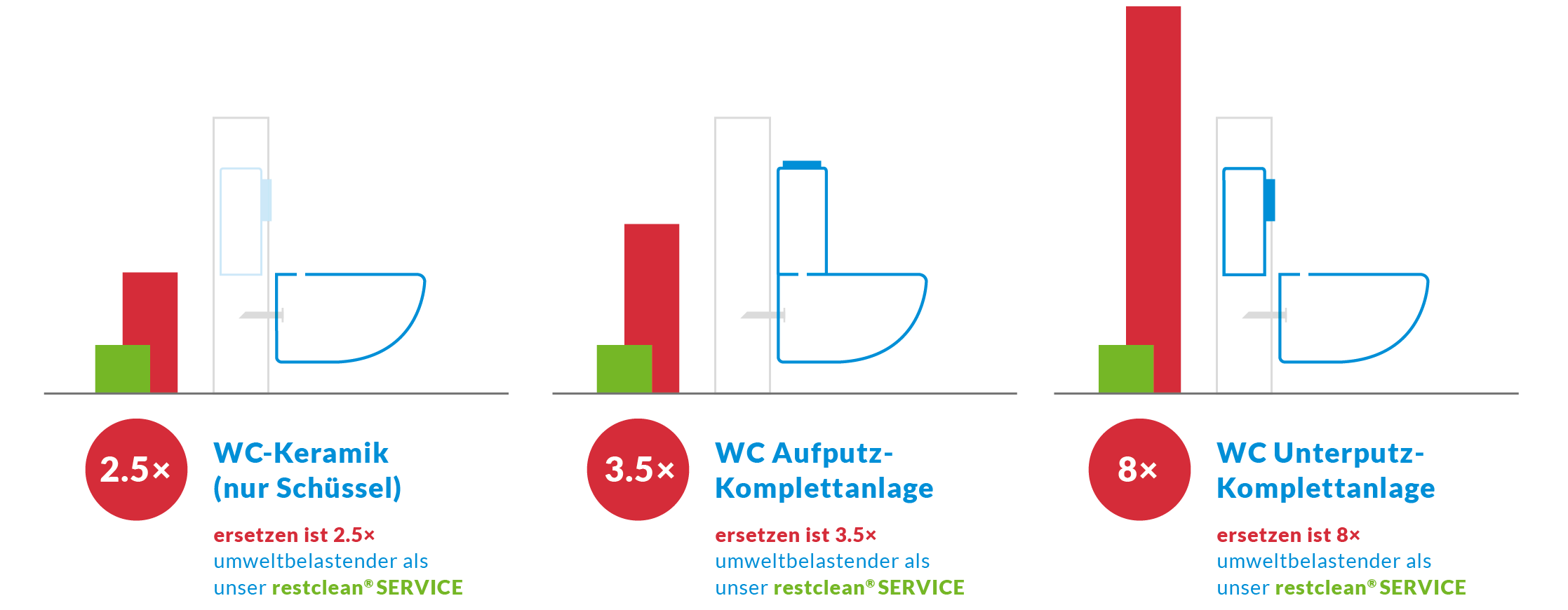 Das Resultat zeigt die Grafik sehr deutlich. Der restclean®SERVICE ist für die Umwelt 2.5 bis 8 Mal weniger belastend als der Ersatz der WC-Anlage.